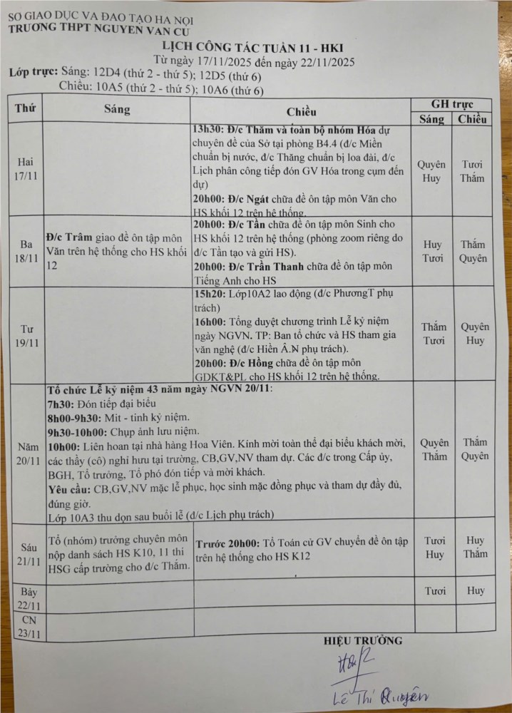 Ban Giám hiệu nhà trường trân trọng thông báo Lịch công tác Tuần 11 như sau: