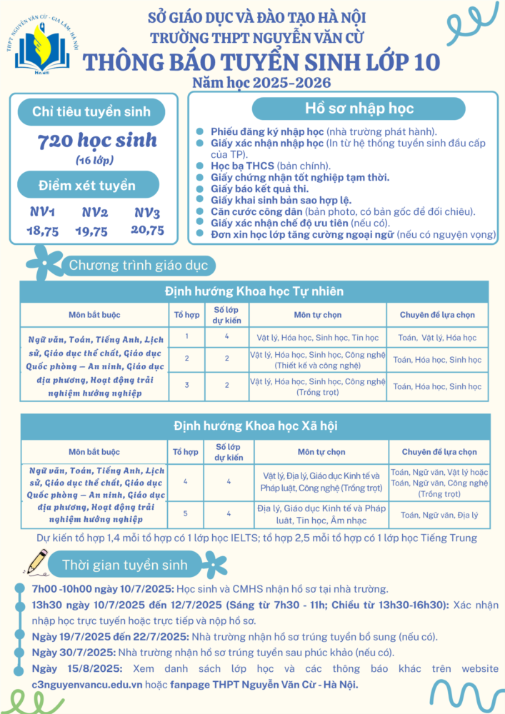 Trường THPT Nguyễn Văn Cừ xin gửi lời chúc mừng tới các em học sinh đã vượt qua kỳ thi tuyển sinh vào lớp 10 đầy thử thách. Một cánh cửa mới đã mở ra, và giờ đây là lúc các em chọn cho mình một môi trường học tập phù hợp, vững vàng đồng hành trong ba năm cấp 3.