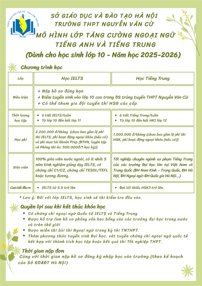 Bên cạnh lớp tiếng anh IELTS như các năm trước, năm nay nhà trường triển khai thêm lớp Tiếng Trung tăng cường – mở rộng lựa chọn cho các em học sinh có định hướng phát triển ngoại ngữ ngay từ đầu cấp. Tham gia lớp tăng cường, các em sẽ được học cùng đội ngũ giáo viên chất lượng cao và có cơ hội sở hữu chứng chỉ quốc tế (IELTS hoặc HSK), được miễn thi môn Ngoại ngữ trong kỳ thi tốt nghiệp THPT nếu đạt yêu cầu đầu ra, xét tuyển đại học bằng chứng chỉ ngoại ngữ quốc tế, đồng thời nâng cao năng lực hội nhập và khả năng cạnh tranh học bổng trong nước lẫn quốc tế…